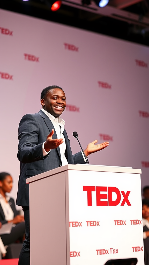 A vibrant young African man exudes confidence as he smiles warmly, addressing a captivated audience from a platform resembling a TEDx stage. The backdrop is a pristine white, adorned with the iconic TEDx logos scattered in an elegant pattern. The atmosphere is charged with inspiration as he passionately shares his motivational message, his expressive gestures amplifying the impact of his words. His charisma and energy light up the stage, making his presence as memorable as his empowering speech.