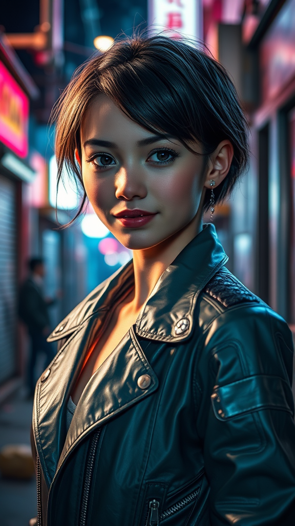 A vibrant young cyborg girl inspired by Deus Ex Mankind Divided, with a mysterious smile and bright, piercing eyes. She's adorned in a stylish blown jacket, reminiscent of fashion magazine elegance, set against the backdrop of a neon-lit night city alley. Her look is enhanced by naturally glossy, maximally natural hair, offering contrast to the gritty slum setting. Photographed with a 150mm lens at ISO 100, the scene captures a mix of high-fashion flair and urban grunge, avoiding any signs of poorly drawn features, broken lines, or digital imperfections. The atmosphere is one of futuristic allure and intrigue, seamlessly blending cyberpunk aesthetics with subtle elegance.