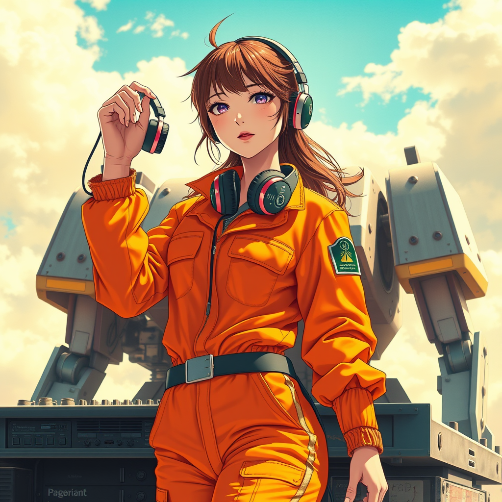 A vibrant young female DJ in a futuristic, elaborate orange jumpsuit holds headphones confidently, set against a backdrop of a classic Mech in a sunny environment. The scene is infused with the essence of music and sound, captured in an anime-inspired, manga-themed movie poster. Bright colors dominate, with high detail and offset printing, evoking a cinematic experience. The poster is depicted in 8K HD, crafted with CMYK color, exuding a happy and natural lighting atmosphere, while maintaining distinct originality within the core concept.