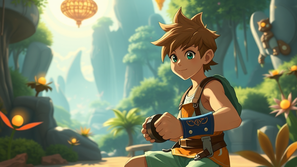 A vibrant young hero working out in a mystical gym, inspired by the imaginative worlds of Miyazaki and Nausicaa, with a touch of Ghibli charm; set in a lush, fantastical environment reminiscent of Breath of The Wild, with dynamic energy and an epic composition showcasing strength and determination. The scene captures a blend of fantastical elements and serene nature, emphasizing the character’s journey and growth amidst ethereal landscapes.