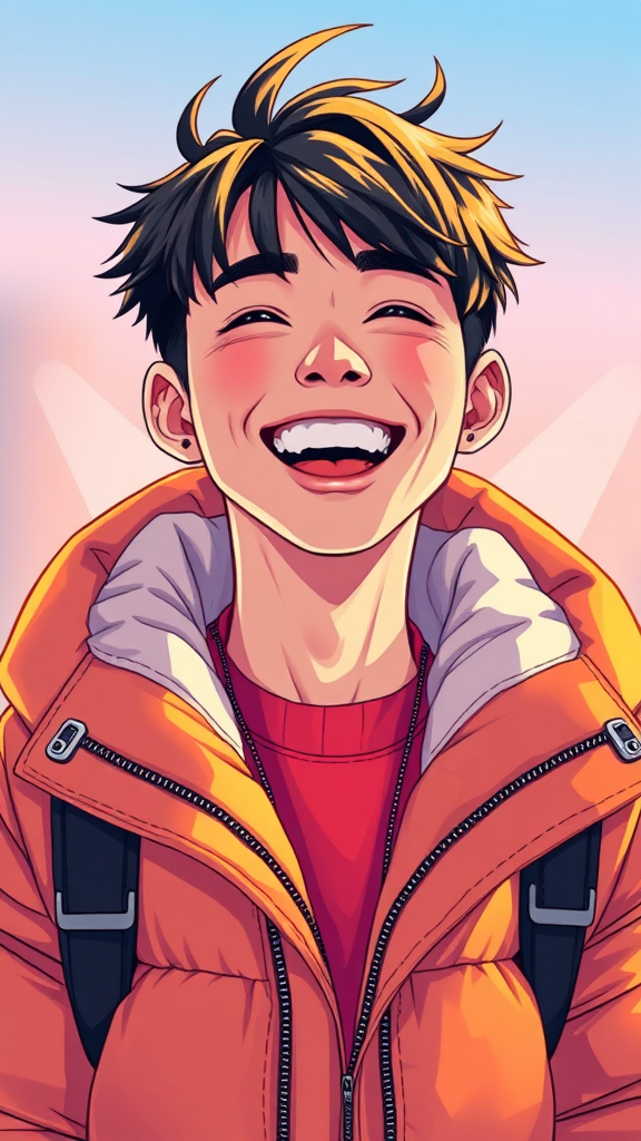 A vibrant young man grins broadly, clad in a poncho-like oversized puffer jacket, drawing inspiration from Off-White aesthetics and Tumblr trends. His look is reminiscent of the artistic flair of Yanjun Cheng, captured in a digital art style. The image echoes the feel of a lofi internet meme, worthy of being a trending feature on Dezeen. It suggests a catalog photo with a 3D render touch akin to Beeple's work, merged with the visual storytelling of Rhads and Lois van Baarle. This cartoon-style illustration is infused with bright, captivating colors, portraying a retro anime-inspired young man, creating a standout piece of beautiful artwork.
