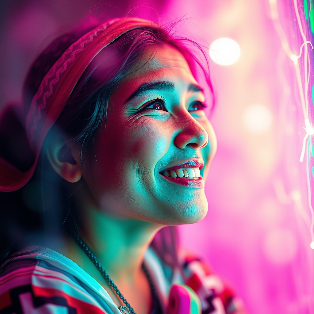 A vibrant young Mapuche woman deep in thought, exuding passion and happiness with a quirky charm, surrounded by a dreamy pastel color palette. The scene is captured in a blend of light painting and bokeh effects, with hyperspectral imagery adding depth. Shot in a telephoto perspective, the electric and fluorescent colors illuminate her joyful expression. Film lighting casts a cinematic glow, with subtle dust particles and hints of electricity in the air, all enhanced through post processing, creating a lively composition in a 9:16 aspect ratio.