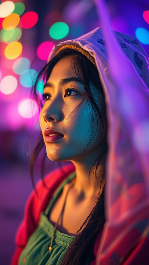 A vibrant young Mapuche woman lost in thought, her mind brimming with passion and happiness, her quirky nature illuminated in pastel colors. A scene brought to life with light painting and glowing bokeh, revealing her in hyperspectral imagery. The telephoto lens captures electric hues and fluorescent tones, enriched by the interplay of film lighting and subtle dust particles, electrifying her aura. The post-processed image embraces cinematic flair, showcasing the unique fusion of culture and modern creativity in an intimate 9:16 aspect ratio composition.