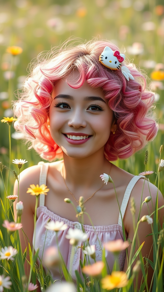 A vibrant young woman in a meadow, surrounded by cheerful flowers and soft grasses, with a whimsical Hello Kitty accessory adding charm. Her pink and blonde curly hair cascades in a playful, short length. The scene is captured in stunning 5k quality, exuding a sense of relaxed joy and wonder, with intricate details reminiscent of a Studio Ghibli animation. The atmosphere is dreamlike, combining nature's beauty with a touch of playful nostalgia.
