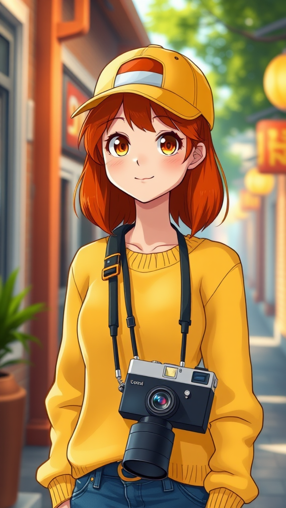 A vibrant young woman in her mid-twenties with striking ginger hair stands with a camera slung around her neck, capturing a sense of adventurous spirit. She wears a playful yellow jumper matched with a yellow baseball cap that complements her lively personality. The character's design and animation are reminiscent of Kentaro Miura's style, highlighted by beautiful natural and volumetric lighting that adds depth and charm. The scene is captured in charming CGI, blending 3D elements with the warmth of an anime illustration and digital painting. Her expression is endearing and lifelike, perfectly emphasized in a high-quality render. The setting is immersive with a cartoon-like allure, ensuring a cohesive and visually appealing representation.