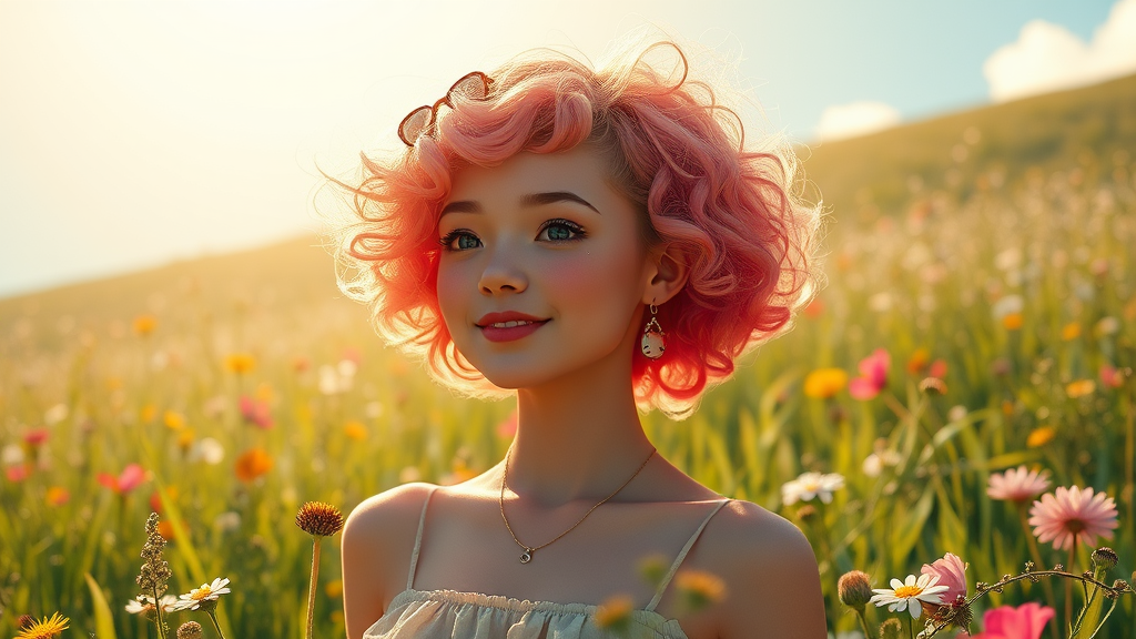 A vibrant young woman stands gracefully in a sunlit meadow, her short, pink and blonde curly hair catching the gentle breeze. She's adorned with subtle Hello Kitty accessories, adding a charming touch to her look. The scene is rich with color and detail, reminiscent of a Studio Ghibli illustration. Wildflowers surround her in a symphony of hues, and the serenity of nature envelops her in a tranquil embrace. The composition captures the essence of relaxation and whimsy in a beautifully detailed, cinematic style.