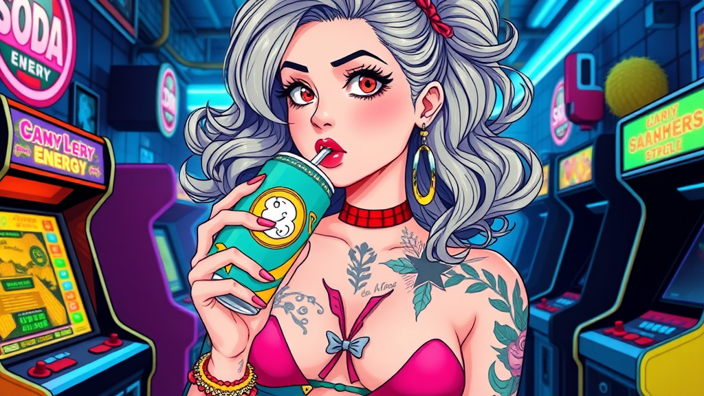 A vibrant young woman with a striking tattoo across her chest, sipping from a colorful energy drink can. Her outfit blends soda-themed elements with a candypunk twist, characterized by bright, sugary colors and quirky accessories. Her hair is styled in voluminous, flowing waves reminiscent of 80s and 90s anime aesthetics. The scene captures the nostalgic charm of retro animation, with bold lines and pastel hues, bringing together a fusion of iconic anime influences and the playful vibe of loish's art style. The backdrop features neon lights and vintage arcade machines, enhancing the 80s anime ambiance.