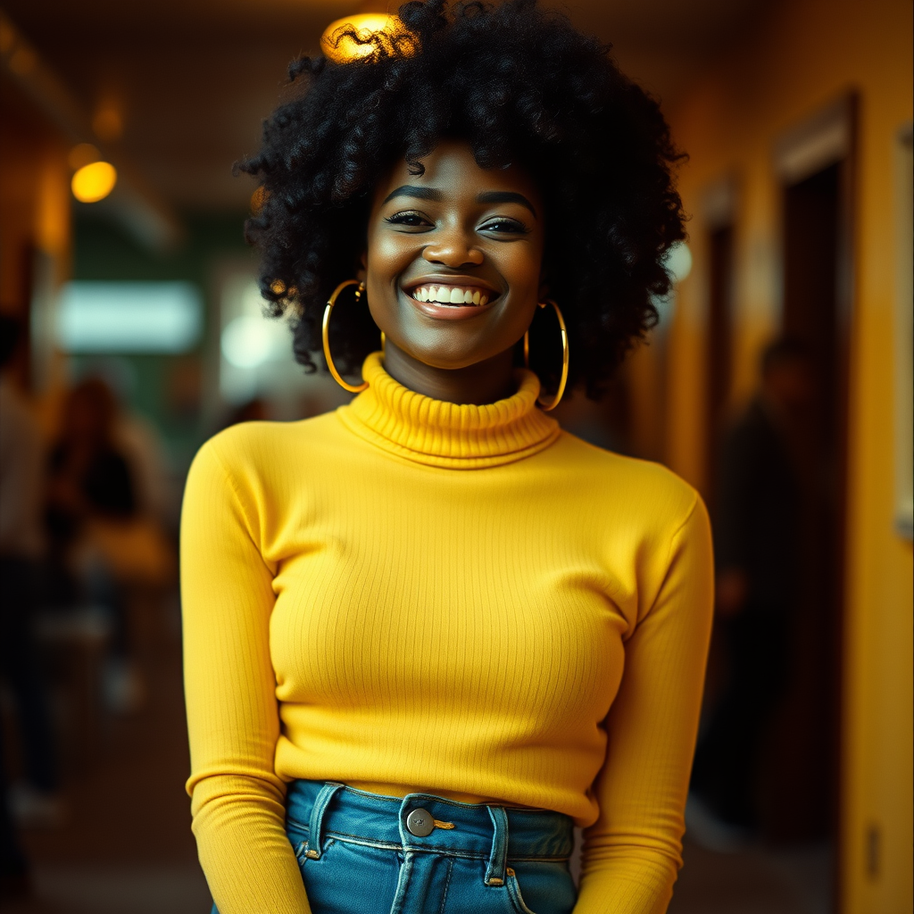 A vibrant young woman with dark skin and a joyful expression, her afro hair styled perfectly, wearing a yellow turtleneck sweater complemented by eye-catching huge hoop earrings. She exudes the 1970s hip-hop vibe, paired with stylish bell-bottoms and flares. The scene is captured in a cinematic manner, with high-frequency details and the essence of 35mm film photography, enriched by film noise and the warm tones of Kodak ProImage 100. The composition features a shallow depth of field, creating a beautiful bokeh effect that enhances her charismatic presence. The overall color palette is infused with harmonious shades of yellow and cyan, adding a unique modern twist to her retro-inspired look.