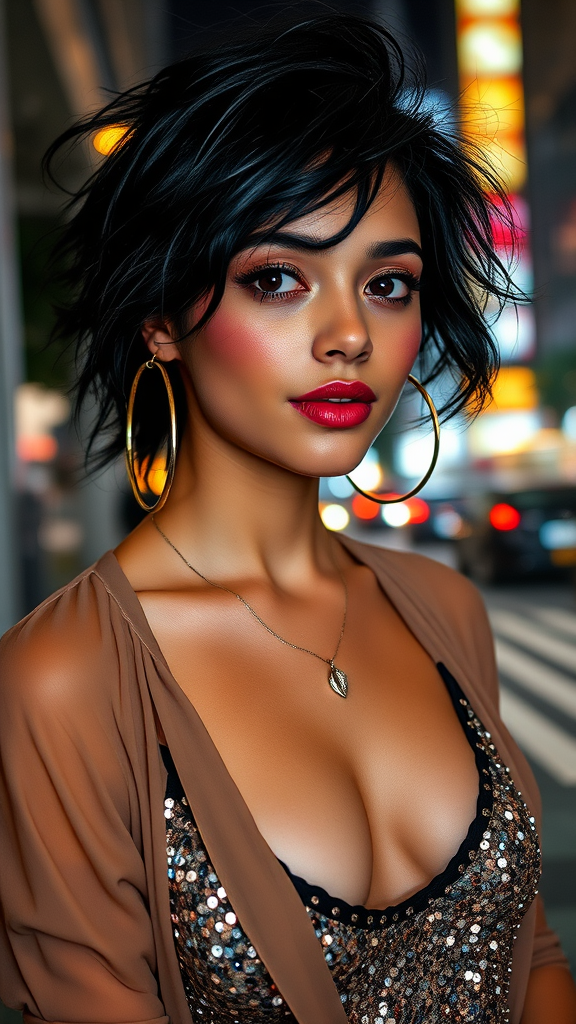 A vibrant young woman with tousled black hair, adorned in a shimmering designer sequin top and a casually open blouse, sports large hoop earrings and a delicate necklace. Her attire is slightly askew, hinting at a lively night out in the bustling city. Her lips are painted with bold lipstick, and her eyes are accentuated by dark, glittering eye shadow. Despite the late hour, she radiates energy, her skin illuminated by the nearby city lights. The scene captures a masterful play of intricate details with enhanced contrast, showcasing her exuberant presence outdoors in the nighttime urban landscape.