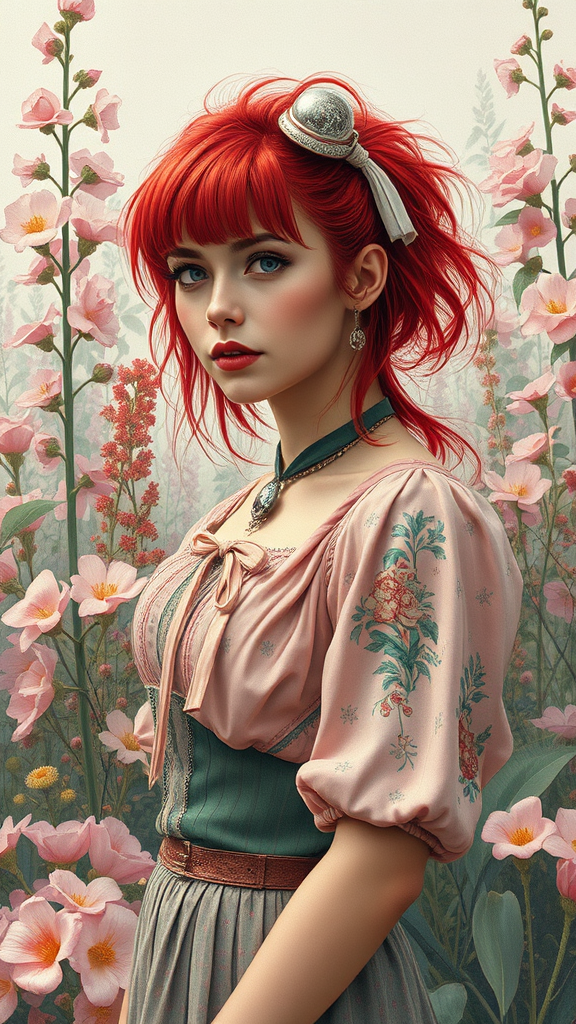 A Victorian 80s punk woman with vibrant red hair stands amidst a burst of pastel colors, surrounded by lush plants and blooming flowers. Her style merges Victorian elegance with punk rebelliousness, embodying a unique fusion of eras. The background is a harmonious blend of nature and artistry, reminiscent of Tom Bagshaw's dreamy touch. Subtle modifications enhance the scene, adding depth and character.