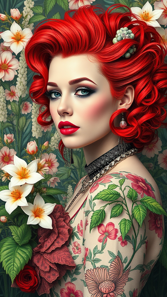 A Victorian 80s punk woman with vibrant red hair styled in wild waves, adorned with splashes of pastel colors among lush green plants and blooming flowers. Her attire merges vintage elegance with edgy punk elements, set against a backdrop of intricate floral patterns. The scene channels the unique artistry of Tom Bagshaw, creating a harmonious blend of contrasts with bold, expressive imagery.