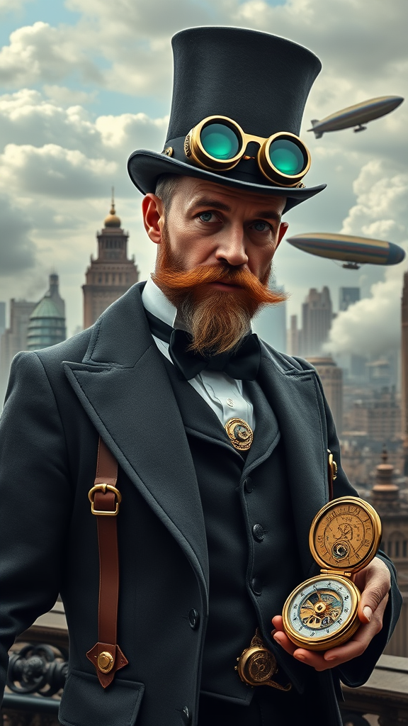 A Victorian gentleman with a meticulously groomed mustache and beard, dressed in an elaborately tailored waistcoat and waist-length frock coat adorned with intricate brass gears and leather straps. His top hat bears a pair of multifaceted goggles, lenses tinged with a subtle green hue, hinting at endless curiosity. In his hand, he holds a polished brass pocket watch, its cover etched with celestial motifs and tiny, rotating cogs. Behind him, the backdrop of a grand, steam-powered cityscape with billowing clouds of steam and dirigibles gliding leisurely through the sky, suggesting a world where the elegance of the past meets the ingenuity of fantastical technology. The atmosphere is one of adventure and precision, encapsulating the spirit of exploration and innovation.