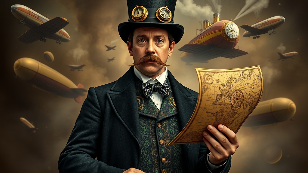 A Victorian gentleman with a meticulously groomed mustache and a top hat adorned with intricate brass gears and goggles, Phileas Fogg stands poised against a backdrop of swirling steam and mechanical wonders. His waistcoat, rich with emerald and gold embroidery, conceals a series of small, copper timepiece gadgets that hint at his adventurous spirit. In his hand, he holds a polished mechanical map, its gears whirring softly, reflecting his precise and methodical nature. Airships and clockwork inventions swirl around him, encapsulating an air of calculated elegance and boundless exploration.