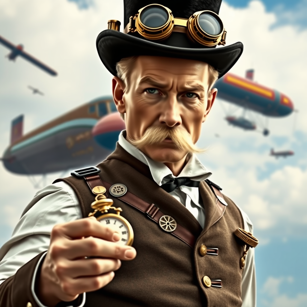 A Victorian gentleman with an adventurous spirit, clad in an elegantly tailored waistcoat adorned with intricate brass gears and leather straps, stands poised with a pocket watch in hand, his expression calm yet determined. His top hat, embellished with intricate cogwork and a pair of brass goggles perched atop, hints at the marvels of steam-driven innovation. Behind him, the open skies reveal airships drifting among the clouds, their propellers churning methodically. His eyes, sharp and calculating, peer from beneath an exquisitely groomed mustache, poised for discovery and exploration.