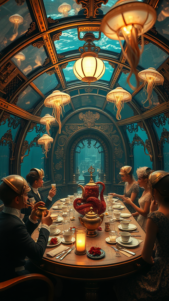 A Victorian steampunk tea party being held underwater in an ornate glass-domed submarine, where octopus waiters serve tea in brass teapots, jellyfish lanterns illuminate the scene with ethereal glow, and elegantly dressed guests don intricate mechanical breathing apparatuses, blending the opulence of the 19th-century aristocracy with the fantastical elements of Jules Verne's '20,000 Leagues Under the Sea' and the whimsical touch of Lewis Carroll's 'Alice in Wonderland', capturing both the grace of historical high society and the adventurous spirit of speculative fiction.
