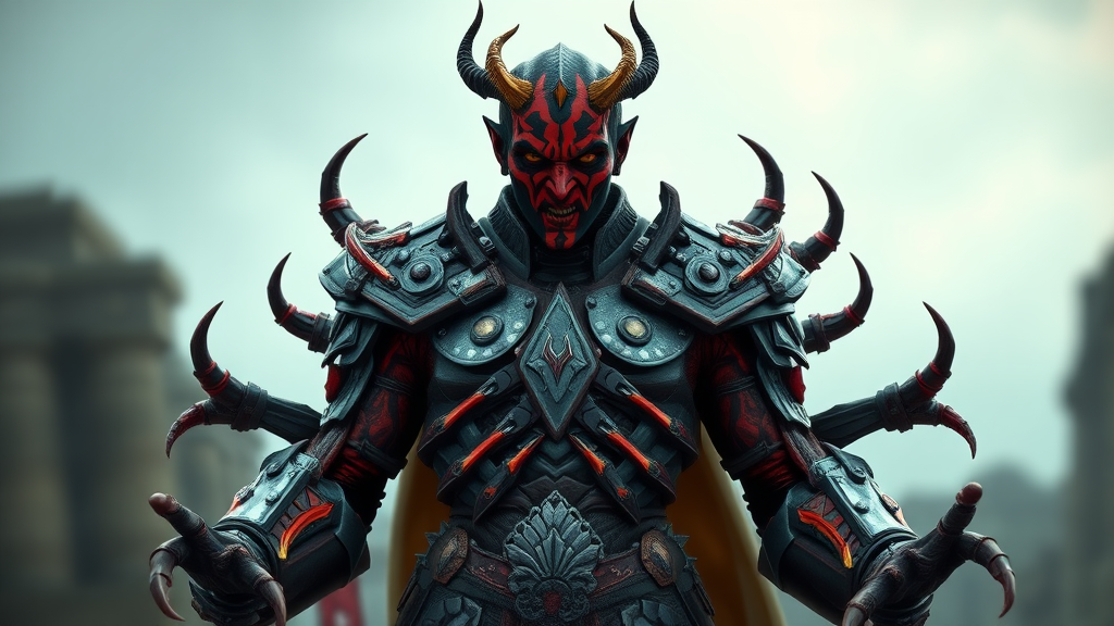 A video game character reminiscent of Darth Maul, featuring full-length armor crafted from intricate dragon bones and metal plates. The character's design is intentionally chaotic, with a disfigured and deformed appearance, including poorly drawn facial features, cross-eyes, and mismatched anatomy. Extra limbs and mutation give a sense of otherworldliness, creating a monstrous silhouette with multiple arms and legs. The character's form is slightly out of frame, contributing to a blurry, disorienting view. Despite its high-fidelity 3D render, the design embraces a deliberately ugly aesthetic with bad art qualities, evoking a sense of eerie unpredictability.