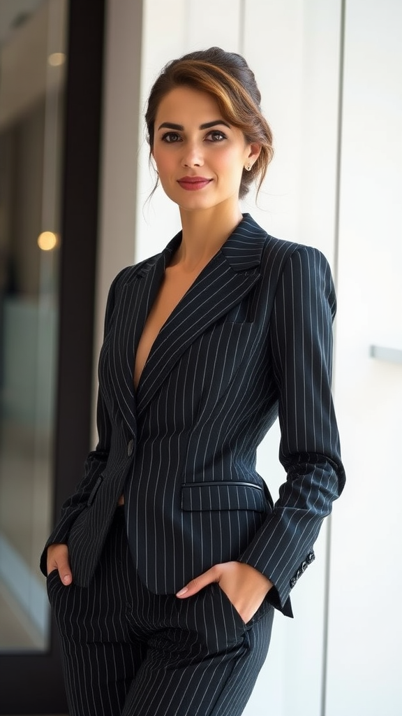 A viewer is instantly drawn to the image of an exceptional female business leader. She dons an exquisitely tailored suit that elegantly highlights her form and emanates authority and elegance. The suit, crafted from a luxurious blend of wool and silk, features a subtle pinstripe pattern that adds a layer of sophistication. It fits her flawlessly, with a sleek lapel and three buttons accentuating her waistline.