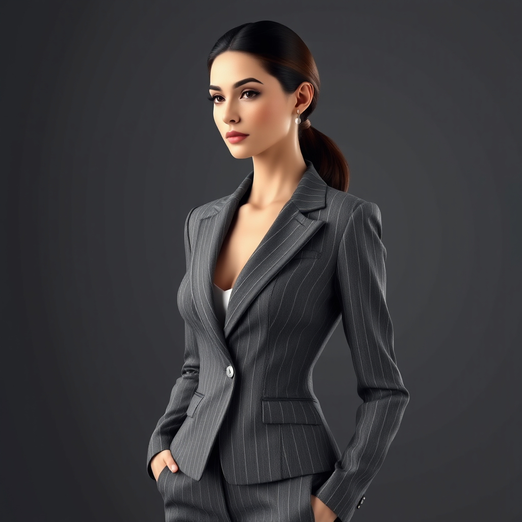 A viewer's gaze is instantly drawn to the stunning presentation of the ultimate businesswoman, who commands attention with her elegance and poise. She is exquisitely outfitted in a sleek, tailored suit that highlights her silhouette, radiating both confidence and authority. The suit is crafted from a rich blend of wool and silk, featuring a delicate pinstripe pattern that enhances its sophistication. The jacket fits flawlessly, boasting a slender lapel and three buttons that draw attention to her defined waistline. The composition captures her essence in a hyper-realistic 3D render, showcasing a work of art that embodies both style and power.