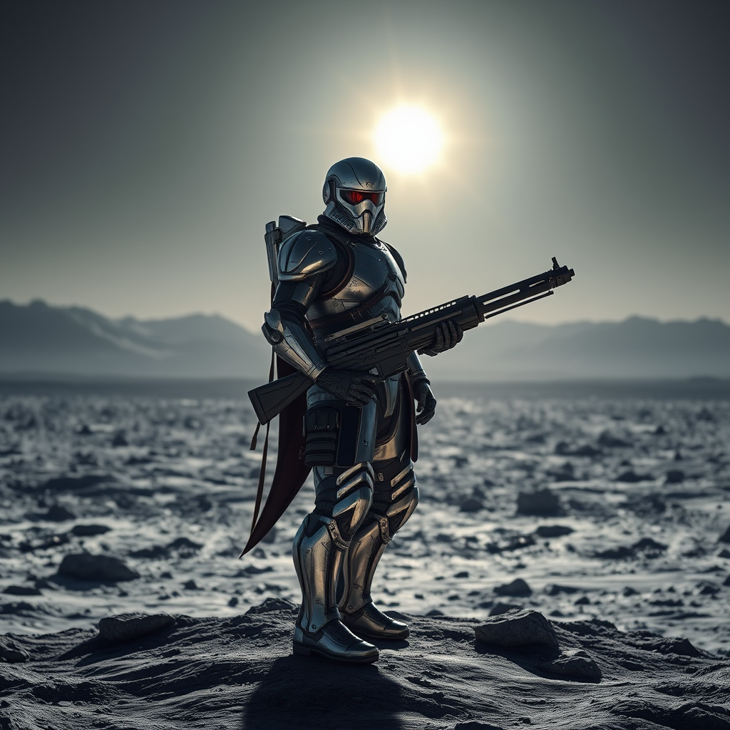 A vigilant guardian stands resolute on a sprawling lunar base, his role as a futuristic peacekeeper evident in his commanding presence. Clad in intricately forged, sleek armor that glints under the distant sun, he wields an advanced energy rifle, its design blending cutting-edge technology and artistry. The scene unfolds in cinematic grandeur, captured in breathtaking HDR and crystal-clear 8K resolution, showcasing the base's expansive, otherworldly landscape with a vertical orientation that emphasizes the moon's vastness. The atmosphere evokes a sense of tranquility and order, the peacekeeper's watchful gaze ensuring a future of harmony.