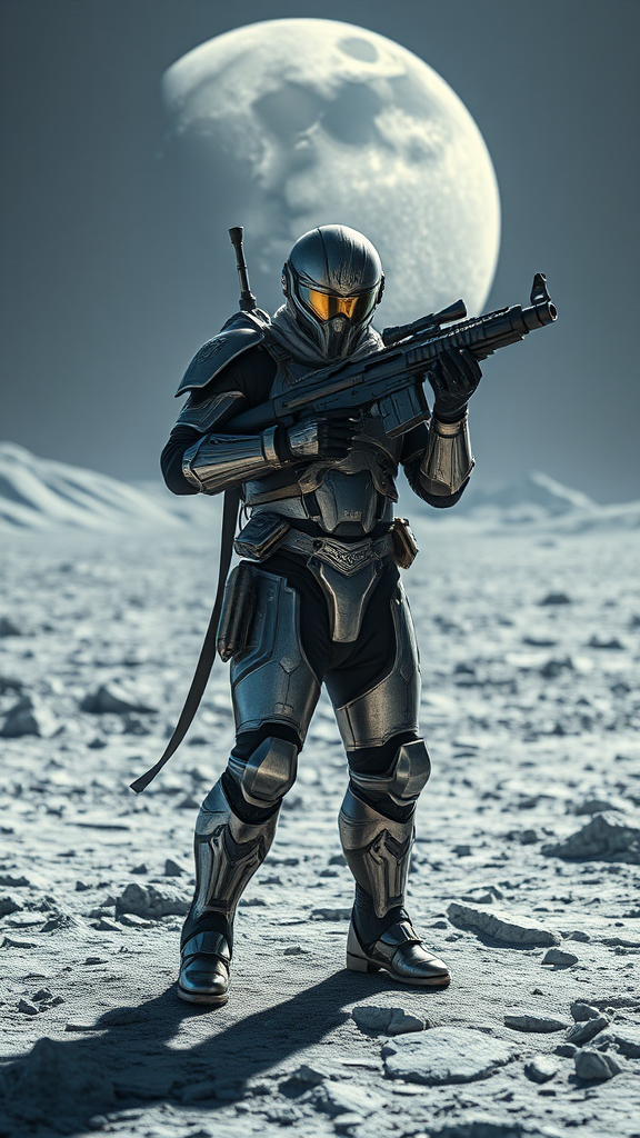 A vigilant man stands as a peacekeeper on a futuristic moon base, donning intricately forged armor that glistens under the harsh lunar light. He wields an advanced energy rifle, its design sleek and formidable, embodying the cutting edge of futuristic weaponry. The cinematic landscape around him unfolds in stunning HDR clarity, captured in 8k resolution. The tranquil and expansive environment is painted in a wide-angle view, emphasizing the vastness of the lunar base and the man's solitary yet resolute duty. The scene is artfully composed within a striking 9:16 aspect ratio, creating an immersive visual experience.