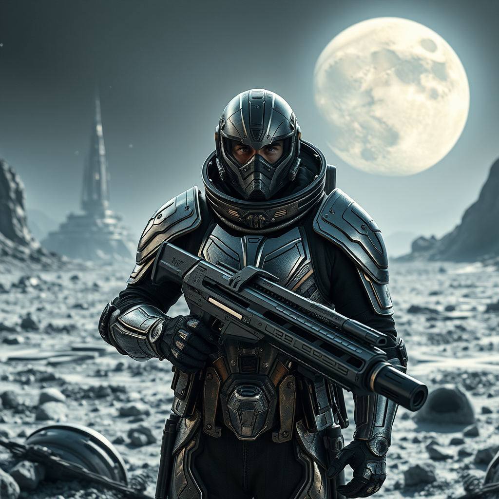 A vigilant man stands guard in a stunning, expansive shot of a futuristic moon base, surrounded by advanced technology and formidable landscapes. As a steadfast peacekeeper, he wears intricately forged armor that glints under the harsh lunar light. His futuristic weapon, an energy rifle, is a marvel of engineering, exuding power and precision. The scene is captured with cinematic flair, boasting HDR clarity and breathtaking 8k resolution, enveloping the viewer in a visually immersive experience.