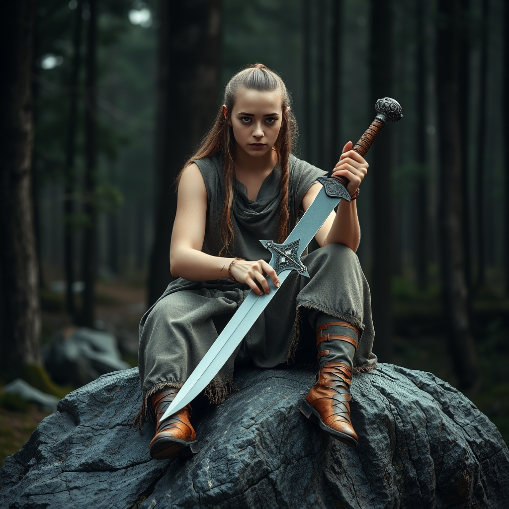 A Viking girl sits confidently on a weathered rock, clutching a sword with an intricate hilt, set against a serene forest backdrop. Her gaze meets the viewer's with intensity. The setting is captured in exquisite realism, showcasing detailed textures of skin and clothing, in a full-length frame. Captured with the precision of professional photography, utilizing 8K resolution for hyper-detailed imagery. The scene is illuminated with diffused, soft lighting, enhancing the photo's cinematic quality. Using a Nikon D750 with the Brenizer Method for a precise side-view perspective and a depth of field effect, the photo renders the scene in stunning F/2.8 clarity, with a subtle lens flare adding drama. Graded with tonal colors in a ProPhoto RGB spectrum, the image ensures perfectionist lighting with natural accents and precise diffraction. Despite the hyperrealism, the scene retains authentic qualities with minor imperfections for a lifelike appeal. The girl's attire is incredibly detailed, reflecting the craftsmanship of minimalist Viking aesthetics while avoiding common photographic errors like poor quality, jpeg artifacts, and unnatural anatomy. Every element contributes to an evocative and immersive portrayal of a historical narrative.