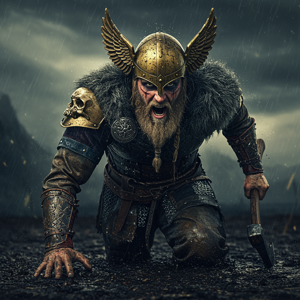 A Viking king pushes through the wet black mud, his golden helmet adorned with twin soaring wings glinting dully under the overcast sky. His war armor, emblazoned with skull motifs, clinks softly with each movement, while dark war paint streaks across his weathered face, enhancing his fierce glare. A tangled, scruffy blonde beard bristles with droplets of mud, framing an expression of raw anger. A jagged scar slices across his cheek, a testament to past battles. Clutched in his hand is a hefty Viking axe, a symbol of his indomitable spirit. The scene is enveloped in cinematic lighting, with shafts of volumetric light cutting through the gloom, casting moody shadows that blend with the dripping mud cascading from his armor.