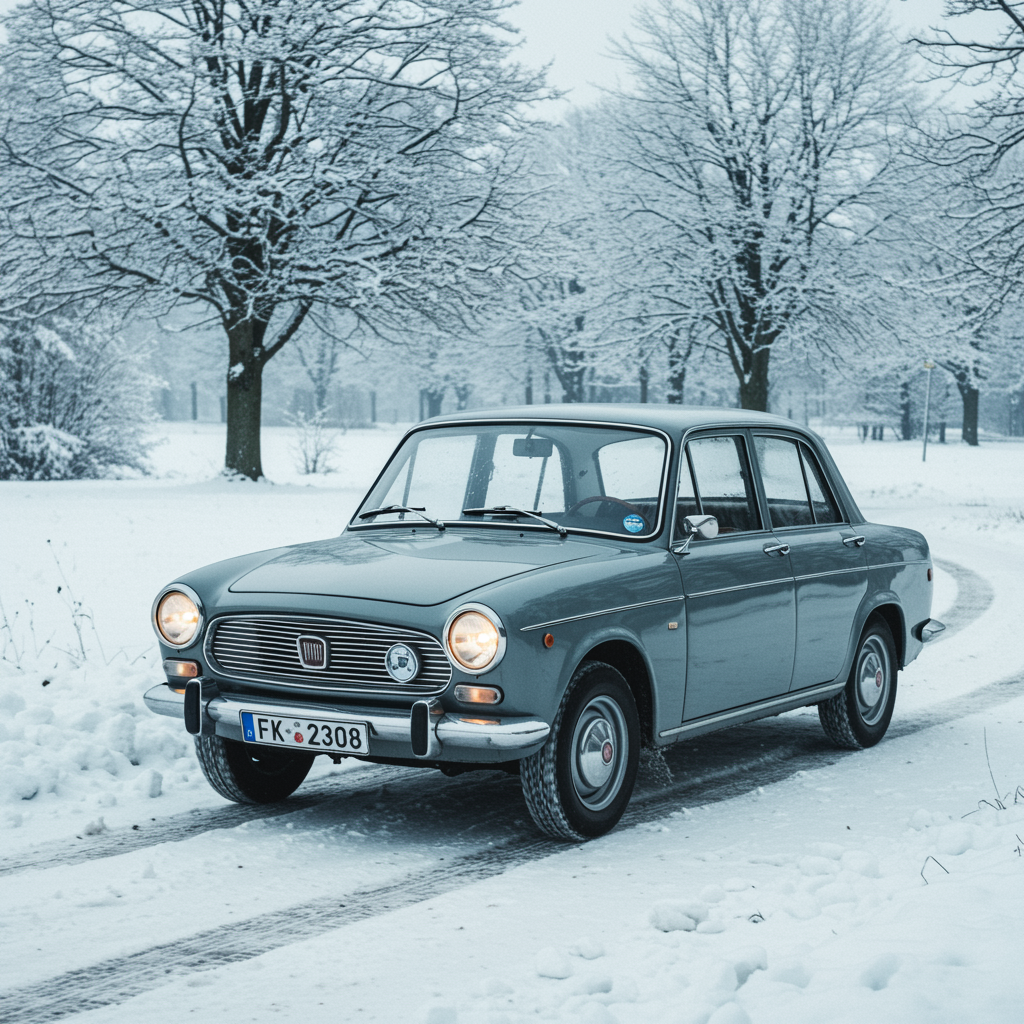 A vintage 1960 grey Fiat Tipo sedan, slightly modernized, drives through a serene winter landscape, its sleek form glistening with frost under the dim, soft glow of the overcast sky, tires leaving delicate tracks on the lightly snow-dusted road, surrounded by whispering bare trees draped with snow.