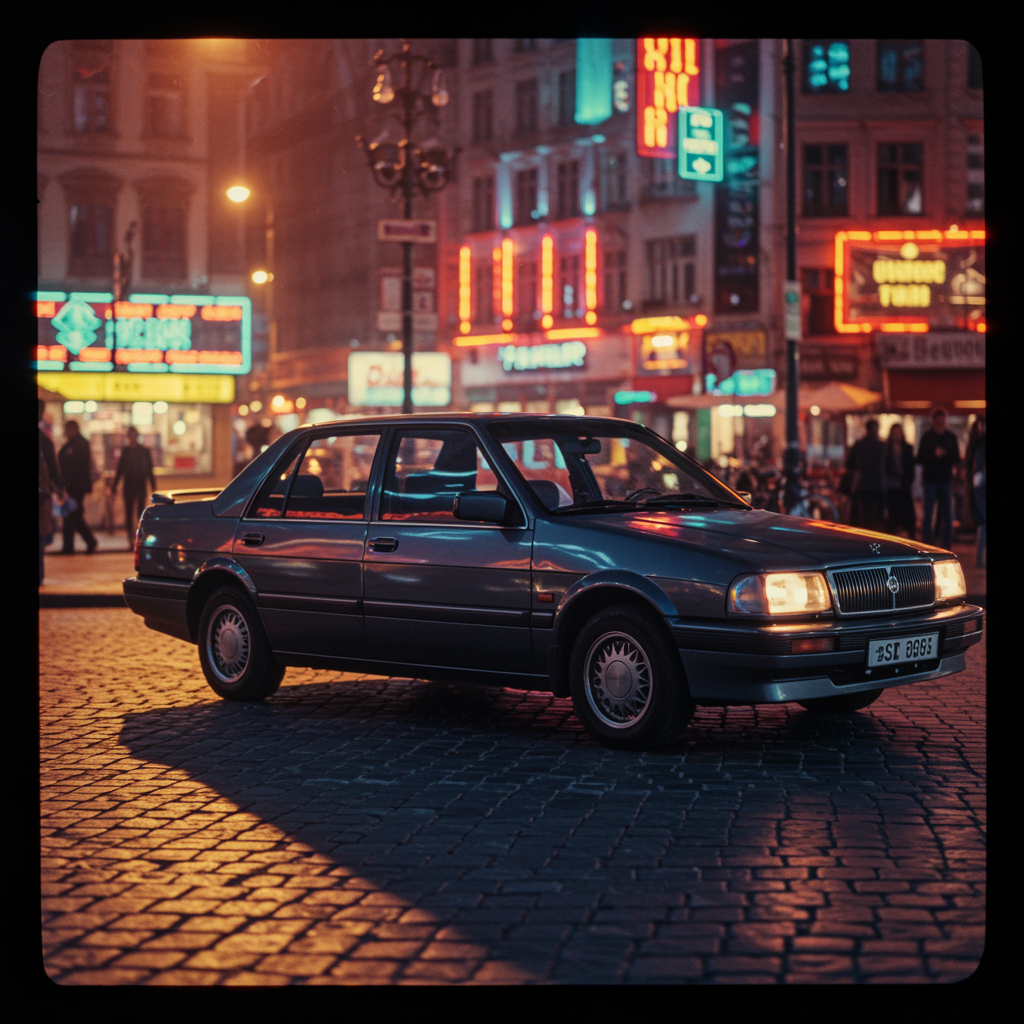 A vintage 90s classic car parked against a vibrant cityscape backdrop, capturing the essence of the era in vivid 35mm detail. Gleaming chrome accents and polished curves reflect the warm glow of streetlights, while a bustling urban scene with neon signs and people passing by adds dynamic energy to the composition. The car's shadow stretches across the cobblestone street, evoking a nostalgic yet timeless feel, as if frozen in a moment of cinematic storytelling.