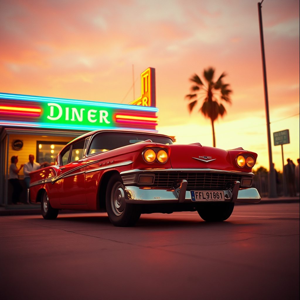A vintage 90s classic car parked in front of a retro diner, captured in a rich 35mm film style, with warm, subtle grainy texture that adds character to the scene. Bold neon lights of the diner cast a colorful glow on the car's polished chrome and gleaming paintwork. The setting sun in the background paints the sky in shades of orange and pink, creating a nostalgic atmosphere. A few patrons dressed in 90s fashion are seen through the diner's windows, creating a lively yet timeless scene.