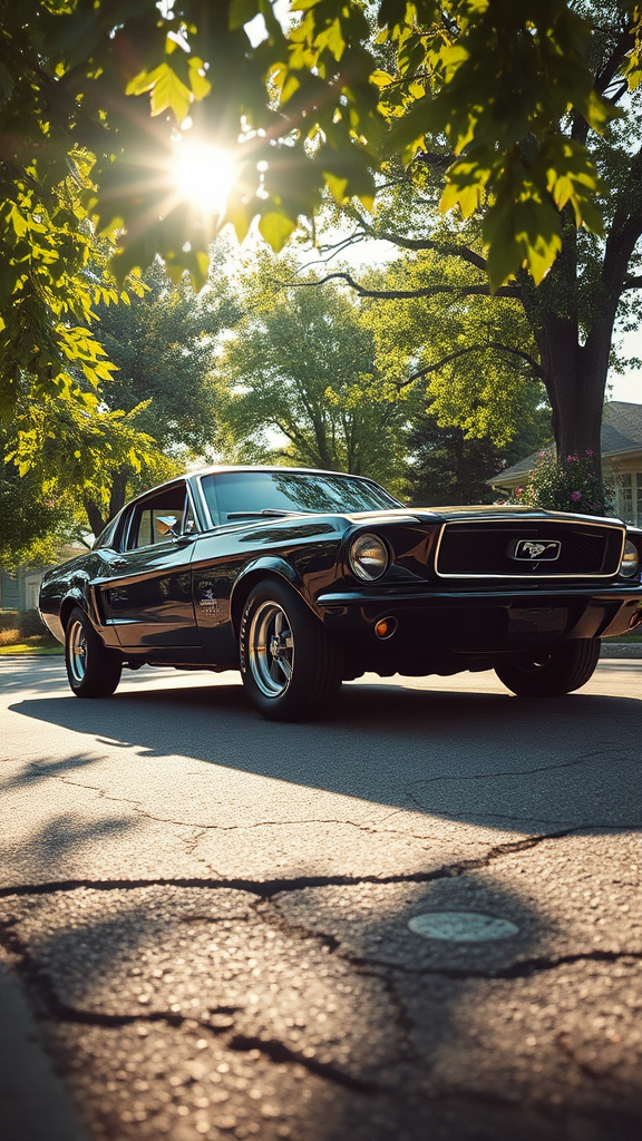 A vintage 90s scene of a gleaming classic Mustang parked on a sunlit suburban street, framed by lush green trees and vibrant wildflowers, captured with a warm 35mm film grain effect in high resolution, subtle sun flares peeking through leaves, casting intricate shadows on the car's polished surface and the cracked asphalt below, evoking a nostalgic, timeless ambiance.