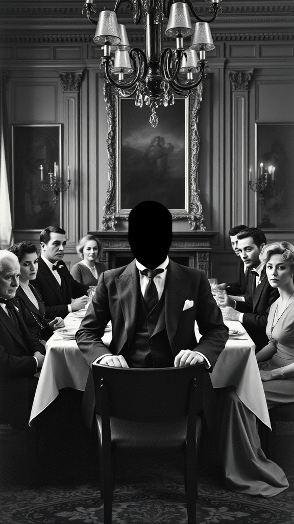A vintage black-and-white photograph shows a group of elegantly dressed men and women gathered around a grand dining table. At first glance, it appears to be a typical high-society dinner party, but the man at the head of the table has his face mysteriously obscured, either blurred or etched away. The other guests cast uneasy glances in his direction, their expressions a mix of curiosity and apprehension.