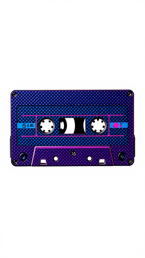 A vintage cassette tape design with a Carbon Fiber texture, highlighted in shades of deep blue and electric purple, reminiscent of Roy Lichtenstein’s pop art style, set against a crisp white background. The image captures a blend of retro nostalgia and modern material aesthetics, with bold comic-style lines and dotted patterns enhancing its dynamic look.