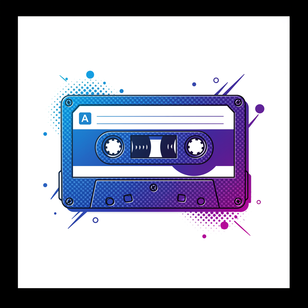 A vintage cassette tape icon in a sleek carbon fiber design, featuring vibrant shades of blue and purple, reminiscent of Roy Lichtenstein's pop art style, set against a clean white background, enhanced with subtle creative twists.