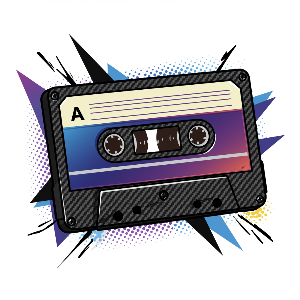 A vintage cassette tape icon styled in carbon fiber, featuring a blend of blue and purple hues, inspired by the pop art style of Roy Lichtenstein, set against a clean white backdrop, with bold lines and dynamic dot patterns adding a modern twist.