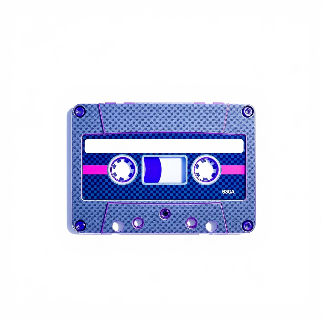 A vintage cassette tape icon styled with a carbon fiber texture, rendered in a vibrant blue and purple color scheme, inspired by the pop art of Roy Lichtenstein, set against a crisp white backdrop, with subtle creative twists to enhance the retro aesthetic.