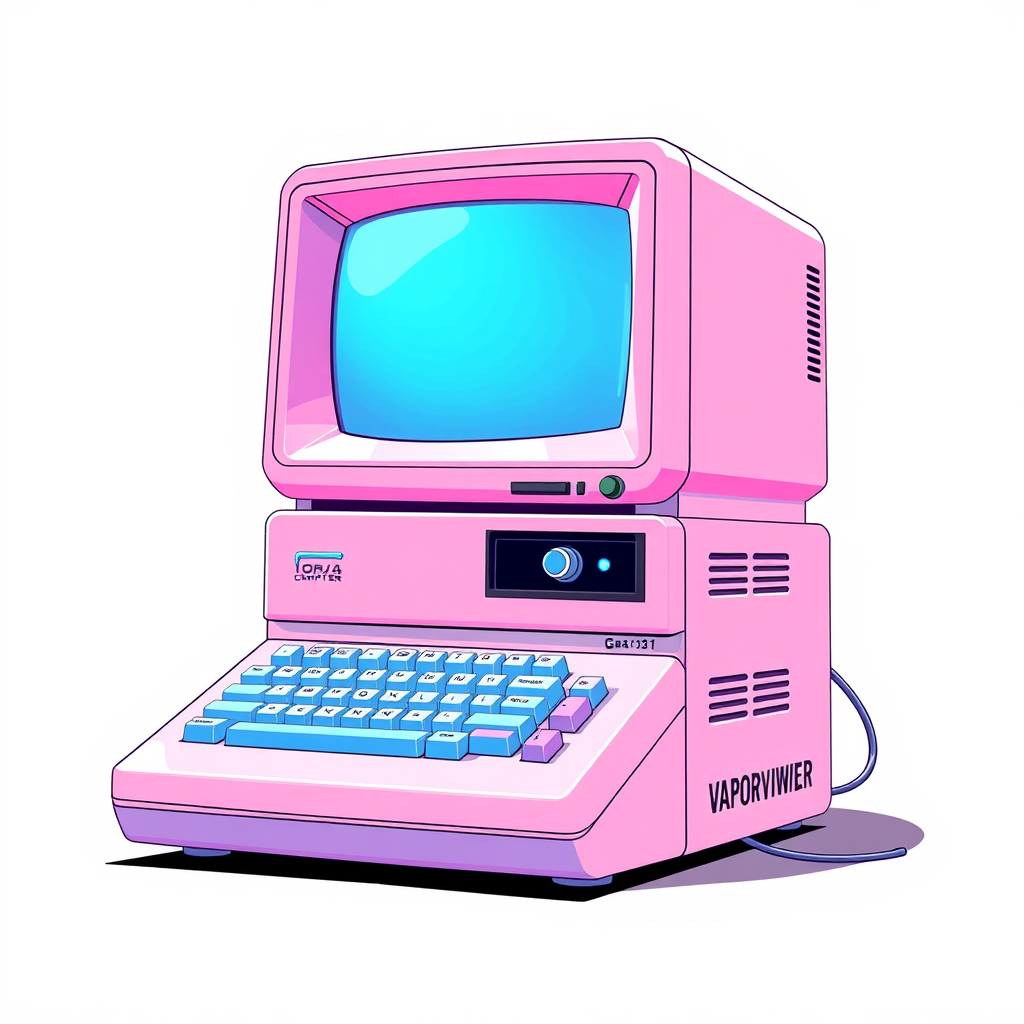 A vintage illustration of a classic computer with a vaporwave aesthetic, featuring soft pastel hues of pink and blue, styled in the dynamic and bold manner of Jim Steranko, set against a minimalist white backdrop, emphasizing neon highlights and retro-futuristic details, Behance.