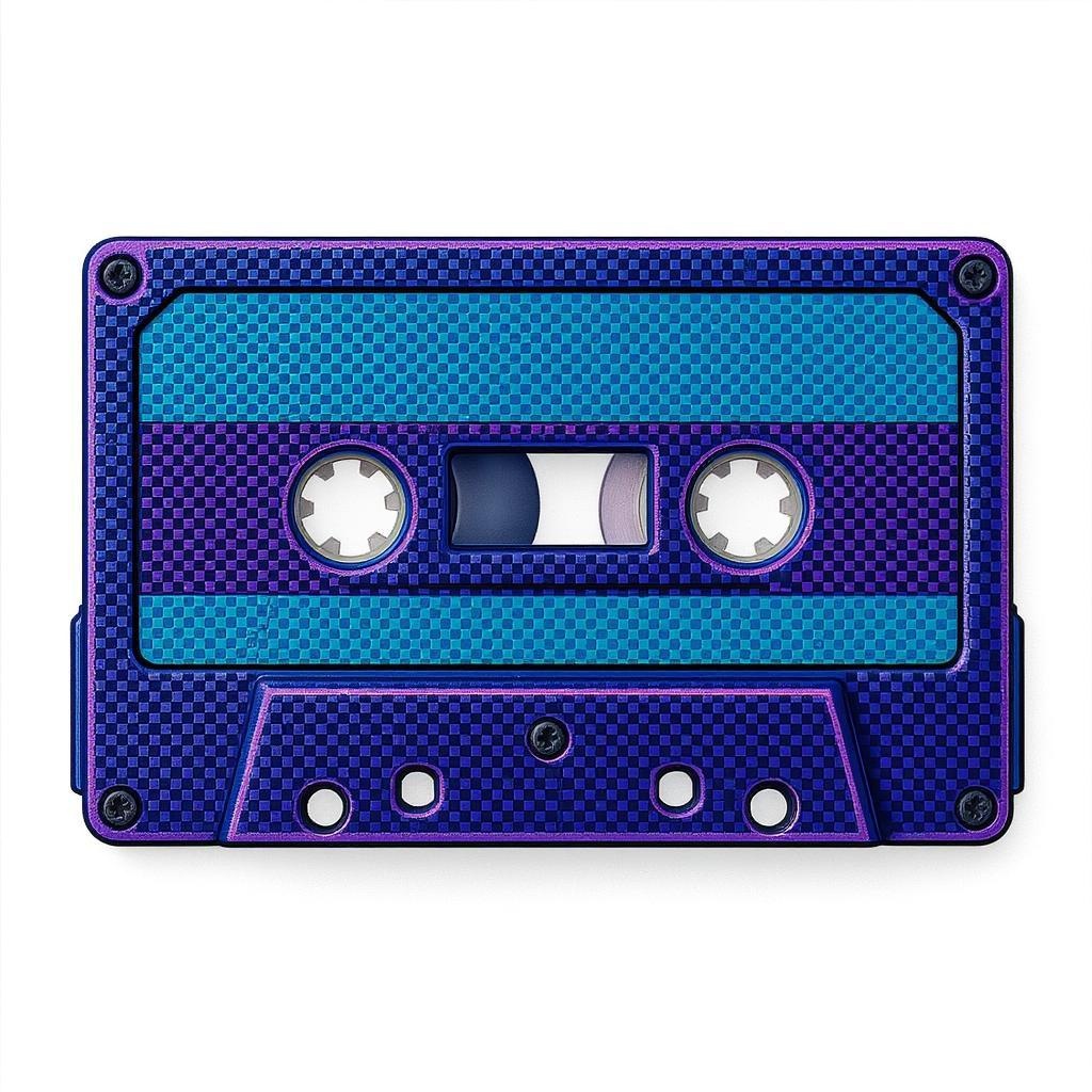 A vintage-inspired cassette tape design featuring a carbon fiber texture, rendered in a vibrant blue and purple palette with a pop art twist reminiscent of Roy Lichtenstein's style, set against a clean white background.