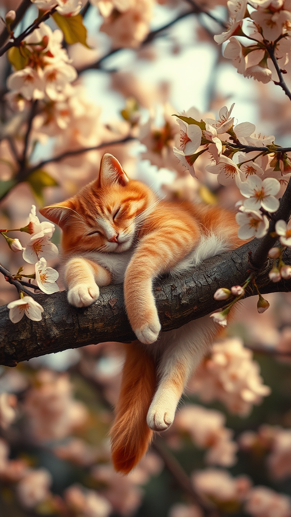 A vintage-inspired photo captures a ginger tabby cat napping contentedly on a tree branch adorned with blooming flowers, its hind legs dangling lazily. The scene is bathed in warm, cinematic lighting, highlighting the catβs fluffy fur and the delicate details of the blossoms.