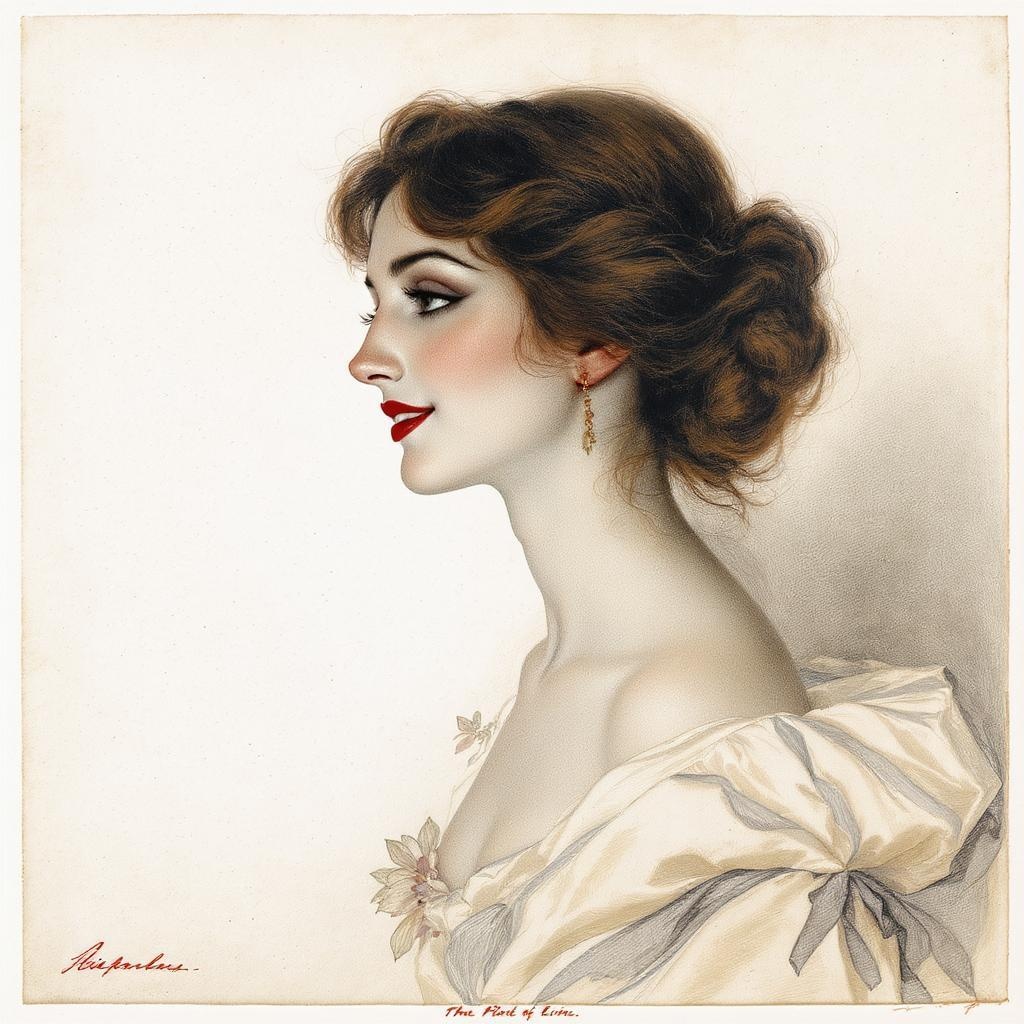 A vintage lithograph depicting a graceful woman in side profile, her features softened by a gentle smile, set against a pristine white background. The scene is bathed in dramatic, moody lighting, capturing the essence of ethereal beauty. The style echoes the dreamlike quality of Odilon Redon’s sketches, with delicate lines and a hint of surrealism. Her elegant attire is subtly embellished with floral motifs, adding a touch of whimsy. The composition captures an air of mystery and timelessness.