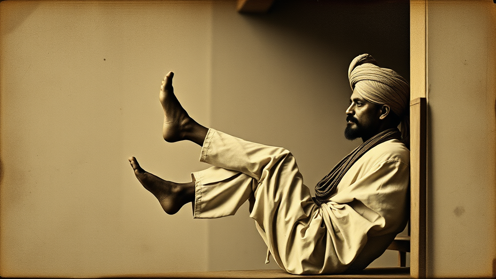 A vintage photograph of an Indian man wearing a traditional turban, his legs elegantly crossed in the air, expressed through the abstract distortion of forms, inspired by contemporary Middle Eastern and North African artistry from the mid-19th to mid-20th century. The scene exudes a contemplative and moody atmosphere, with minimalistic composition, capturing the essence of woven photographic textures, as if lightly crumpled with time.
