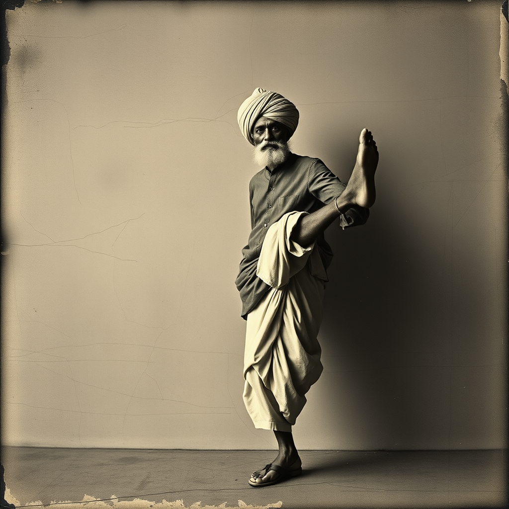A vintage photograph of an Indian man wearing a turban, his legs gracefully elevated, depicted with abstract and distorted forms, influenced by contemporary Middle Eastern and North African artistry from the period of 1860–1969. The scene embraces a brooding atmosphere and minimalist composition, resembling photographic weavings with a textured, crumpled appearance, aspect ratio 3:4, providing an evocative yet simplified visual experience.