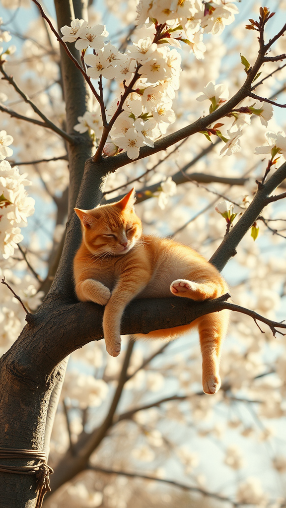 A vintage Polaroid captures a ginger tabby snoozing on the branch of a blossom-laden tree, its back legs dangling lazily in the golden sunlight, evoking a sense of cinematic serenity and nostalgic charm.