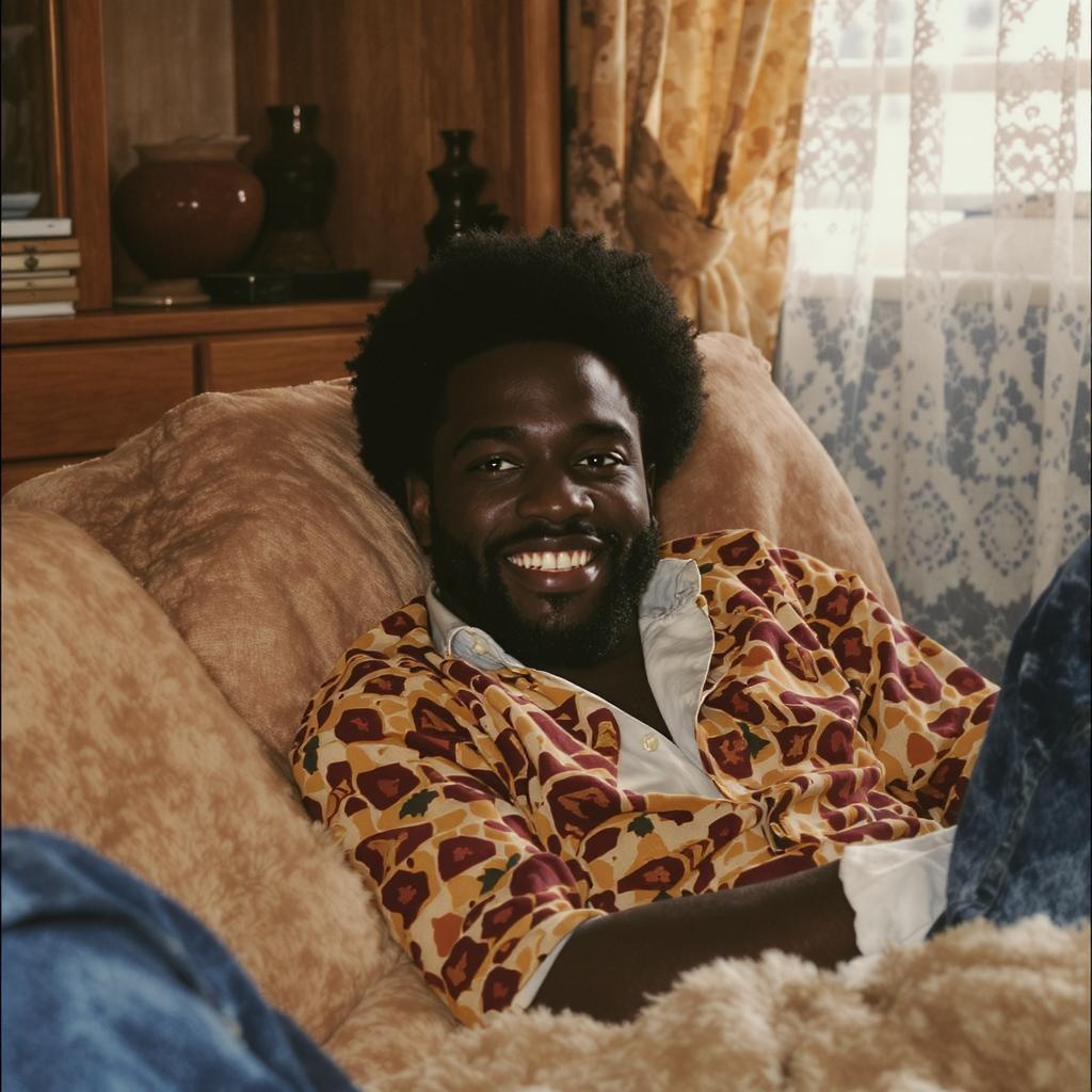 A vintage polaroid photo of an African American man with a short afro and a well-trimmed beard, donning a vibrant, patterned shirt, relaxing on a plush, retro carpet in his cozy early eighties living room. The room is bathed in warm, natural light filtering through lace curtains, highlighting the charming imperfections on his face that embody his unique beauty. He lies with ease, casting a genuine and inviting smile towards the camera, surrounded by an array of eclectic knick-knacks that tell stories of a life richly lived.
