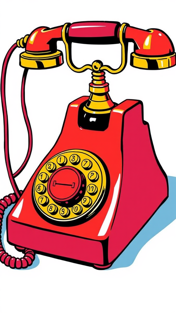 A vintage rotary telephone depicted in a 1930s comic strip style, featuring bold contrasts and a vibrant color palette reminiscent of Paul Gauguin, set against a minimalist white background.