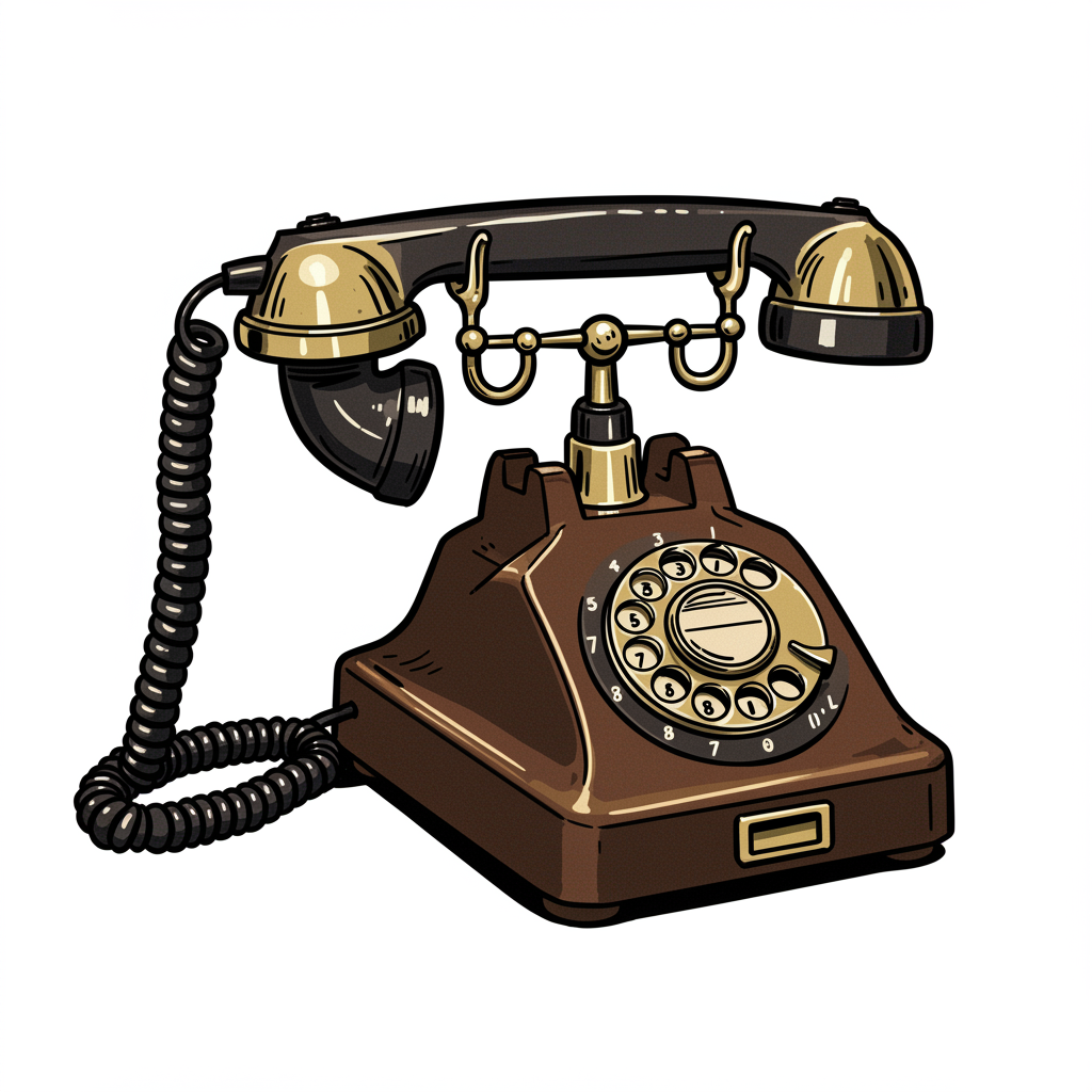 A vintage rotary telephone illustrated in the style of a 1930s comic strip; featuring bold lines and a contrasting color palette reminiscent of Paul Gauguin's artwork; set against a clean white backdrop, with subtle creative flourishes to add a unique twist to the nostalgic theme.