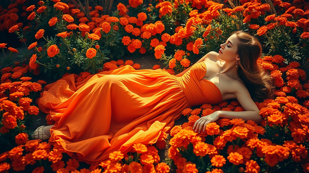 A vintage-style photograph capturing a stunning fashion model in a vibrant orange gown, gracefully reclining on a lush bed of marigold blooms, evoking a dreamy, sunlit garden atmosphere in a warm, nostalgic palette.