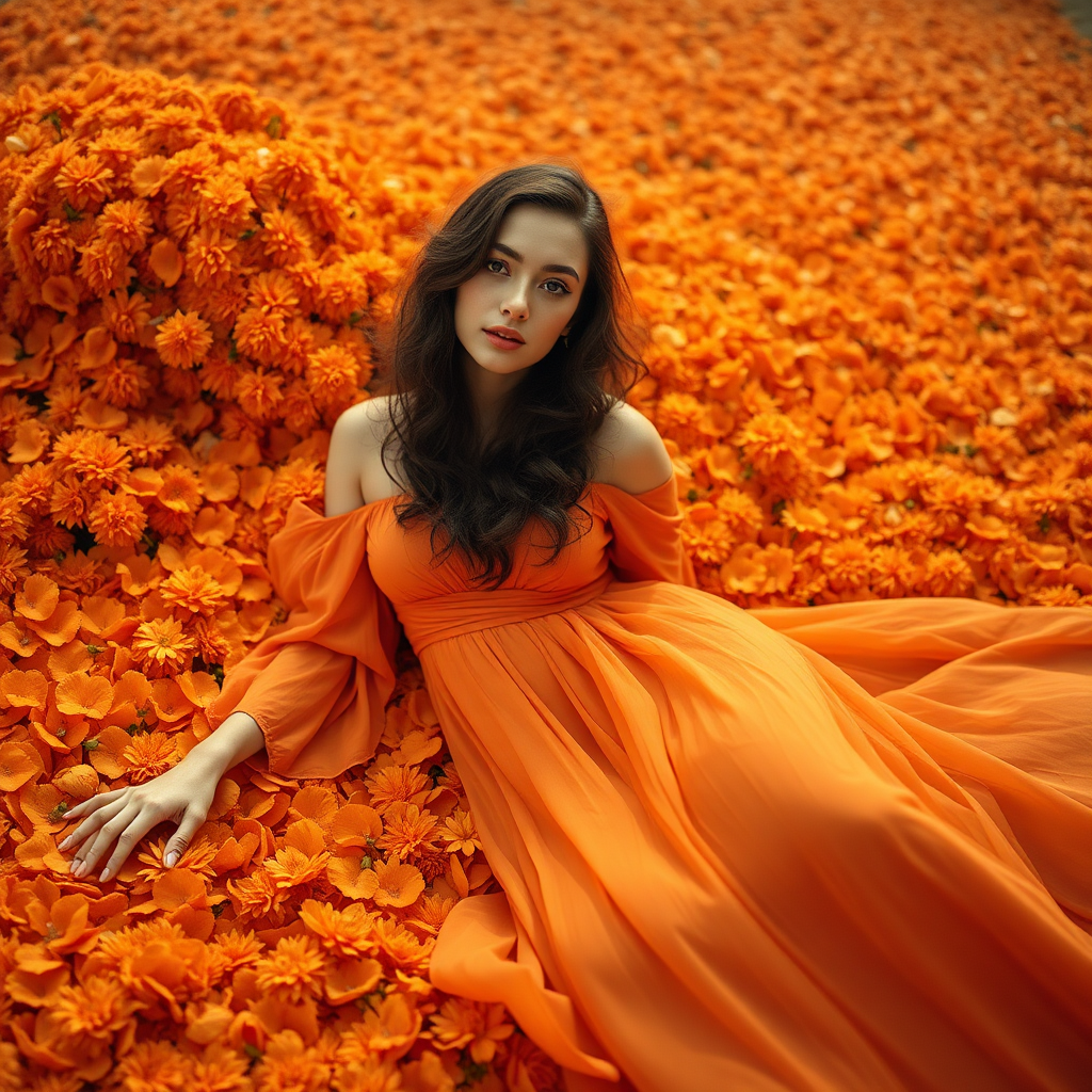 A vintage-style photograph of a stunning fashion model in a flowing tangerine dress, elegantly reclining on a lush bed of marigold petals, capturing a dreamy and nostalgic atmosphere.