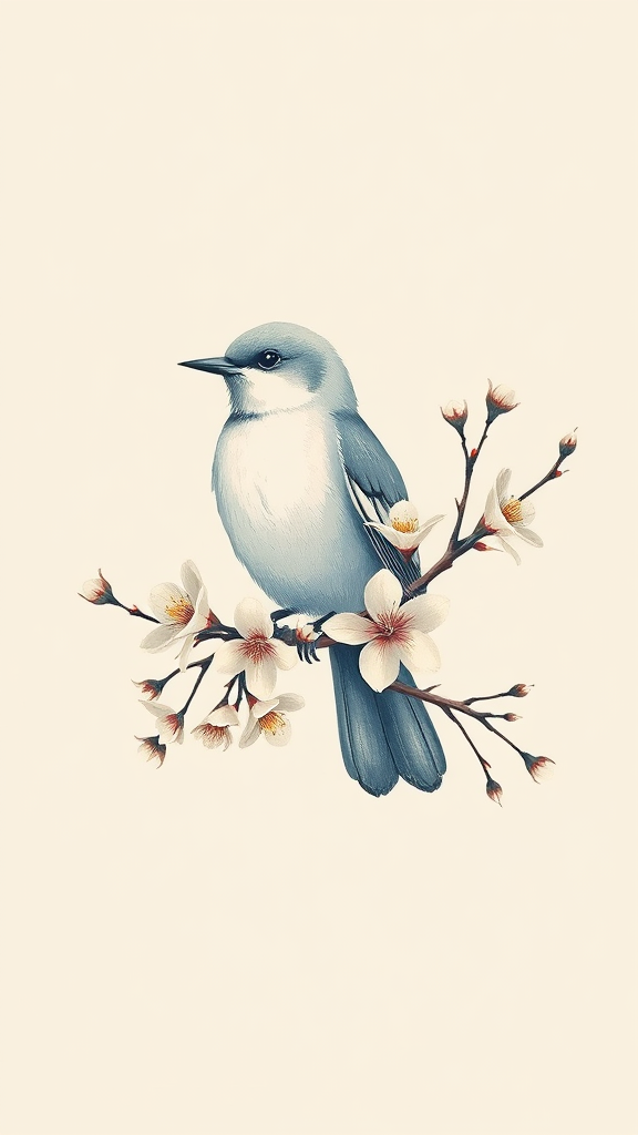 A vintage t-shirt design featuring an abstract aesthetic of a peaceful bird perched on a flowering branch. The design is rendered in high-definition with a timeless, classical feel, reminiscent of Don Martin's style. The edges of the design have a subtle gradient of blue against a white background, embodying a sense of tranquility and elegance.