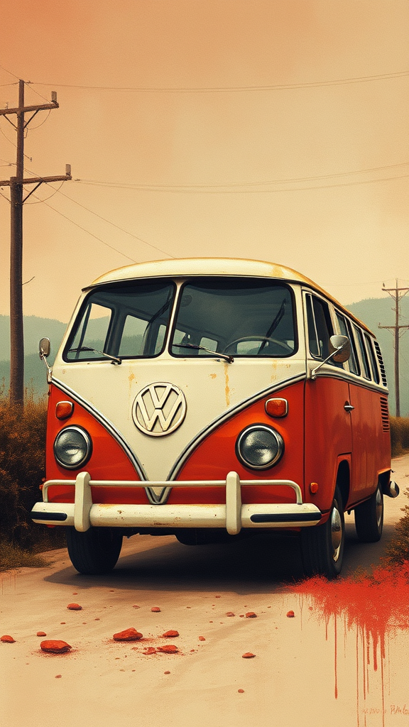 A vintage VW bus depicted in a canvas art style, blending abstract art printing techniques, capturing the essence of Brian Mashburn's atmospheric detail and the whimsical charm of Theo Prins' character illustrations. The scene is imbued with light red and light brown tones, evoking a nostalgic warmth. Elements of Pierre Pellegrini's serene compositions and a vintage cut-and-paste aesthetic intertwine, enhanced by hints of rusty debris, creating a harmonious fusion of past and present in a unique visual narrative.